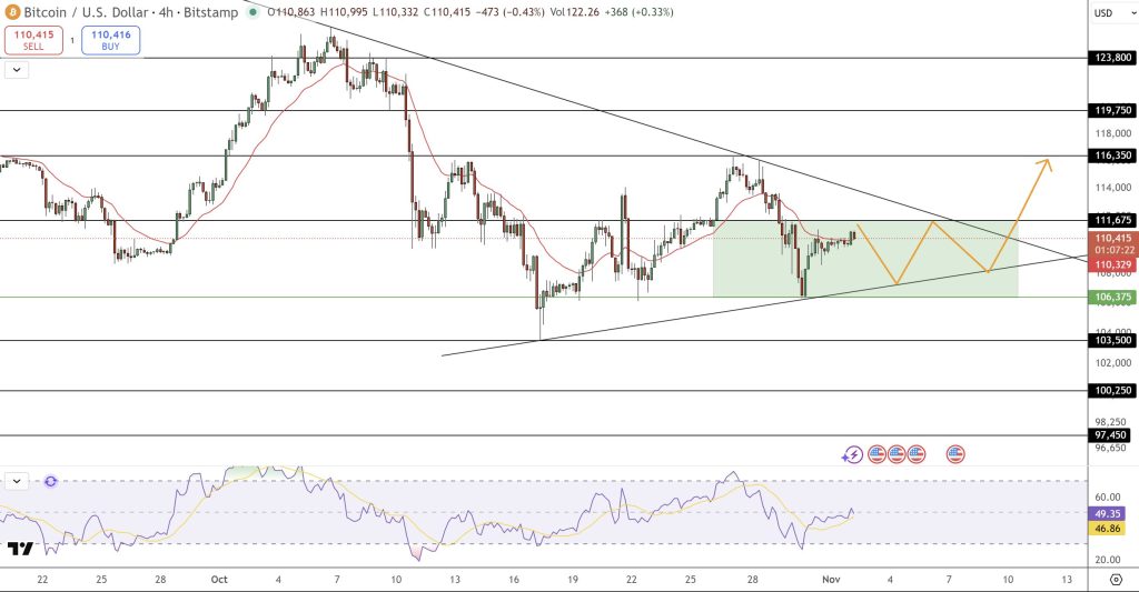 On the technical entrance, Bitcoin value prediction stays impartial as BTC’s value motion exhibits a symmetrical triangle sample, a traditional signal of narrowing volatility earlier than a breakout. The cryptocurrency has discovered constant help alongside its ascending trendline close to $106,375, whereas overhead resistance stays capped at $111,675.